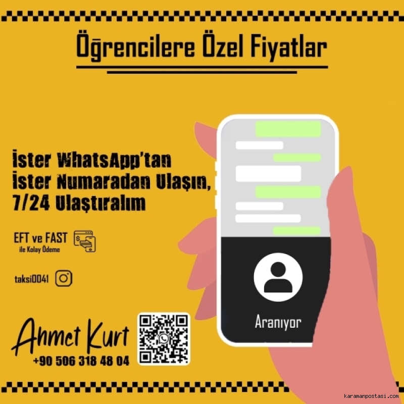 Karaman’da ulaşım alanında öğrencilere yönelik yeni bir kolaylık devreye alındı. Ahmet Kurt tarafından yürütülen özel taksi hizmeti, "Öğrencilere Özel Fiyatlar" sloganıyla şehir içi ulaşımda hem ekonomik hem de hızlı çözümler sunuyor.