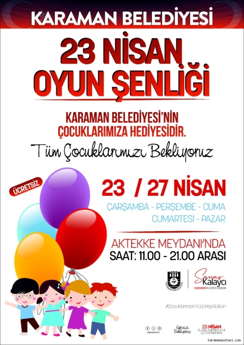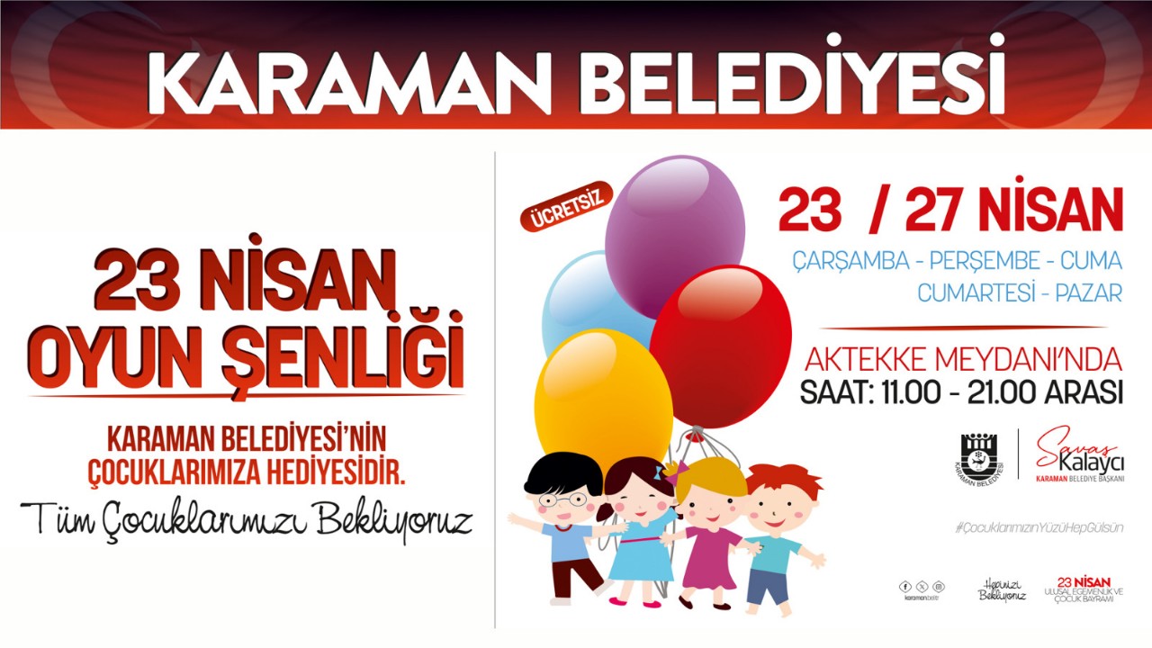 KARAMAN BELEDİYESİ’NDEN ÇOCUKLARA 23 NİSAN HEDİYESİ karaman Belediyesi, 23 Nisan Ulusal Egemenlik ve Çocuk Bayramı nedeniyle çocuk şenliği düzenliyor.Karaman Belediyesi, bu 23 Nisan’da da çocukları unutmadı. Her yıl birbirinden renkli ve çeşitli etkinliklerin yer aldığı çocuk şenliğine ev sahipliği yapan Aktekke 15 Temmuz Demokrasi Meydanı’nda bu yıl da çocuklar doyasıya eğlenecek. Tiyatro gösterileri ve birçok oyun alanı, çocuklara unutamayacağı 5 gün yaşatacak. Şenlik kapsamında 23 Nisan Çarşamba gününden 27 Nisan Pazar gününe kadar, 11.00 – 21.00 saatleri arası çocuk oyun grupları ücretsiz olacak.Karaman Belediye Başkanı Savaş Kalaycı, çocukların 23 Nisan sevincini ve coşkusunu paylaşmaktan mutluluk duyduğunu ifade ederek; 23-27 Nisan tarihleri arasında, Aktekke 15 Temmuz Demokrasi Meydanı’nda gerçekleştirilecek Çocuk Şenliğine tüm çocukları ve aileleri davet etti.