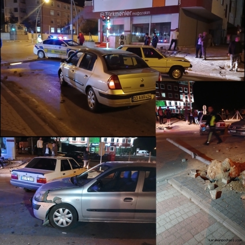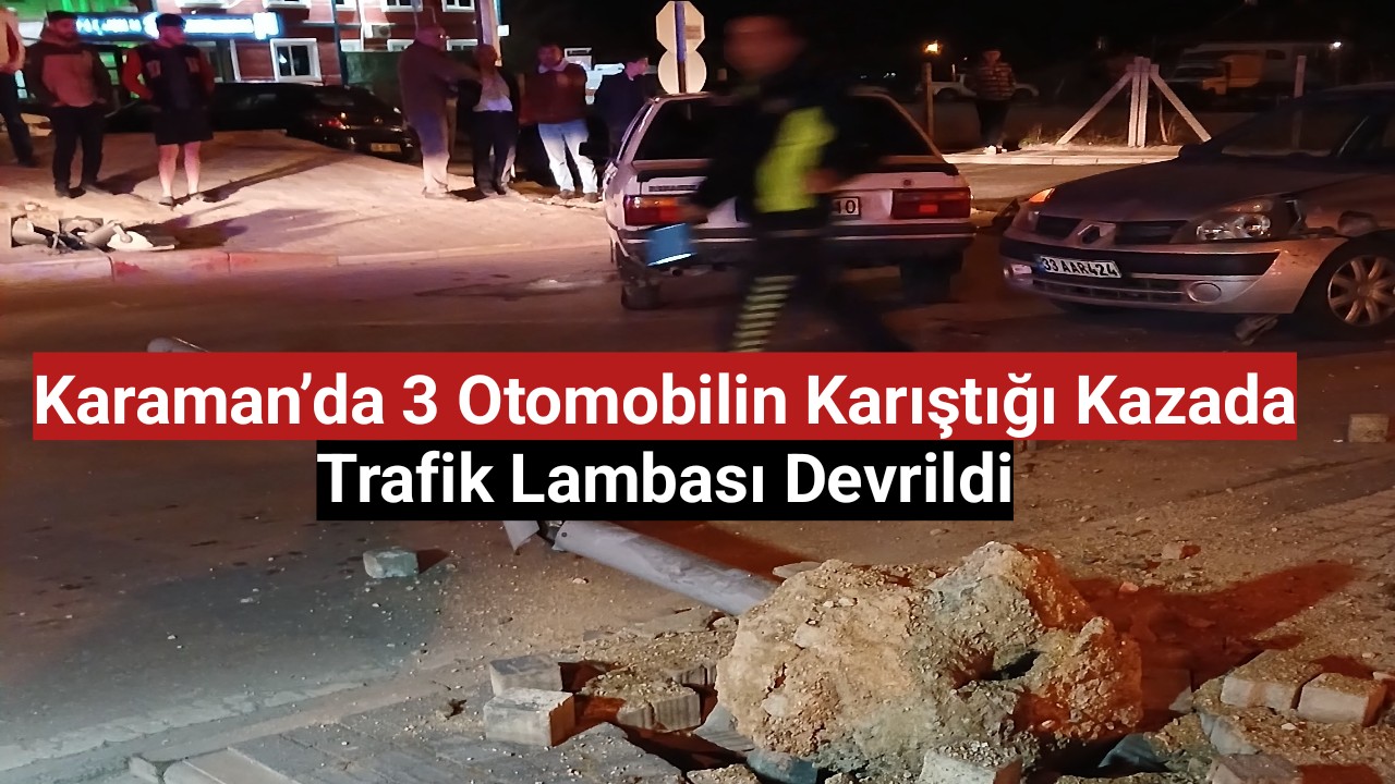 Karaman'da 3 otomobilin karıştığı kazada trafik lambası devrildi