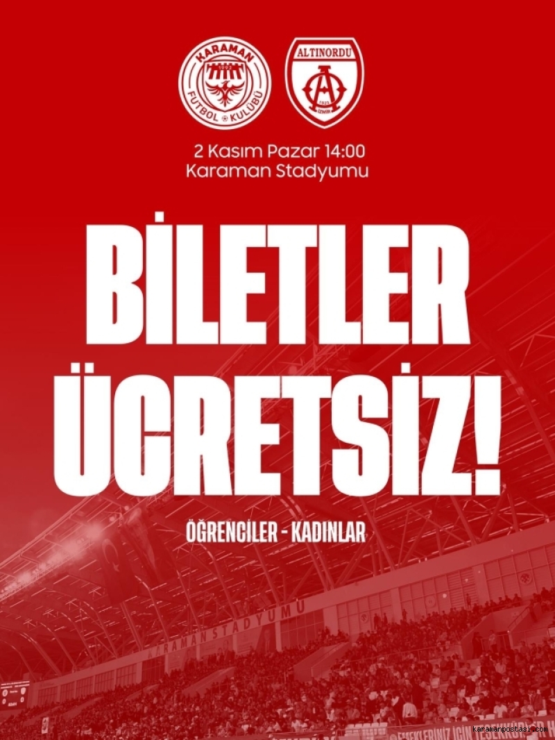 Karaman Futbol Kulübü, 2. Lig’de oynayacağı Altınordu karşılaşması öncesinde taraftarlarına güzel bir müjde verdi. Kulüp yönetimi, 2 Kasım 2025 Pazar günü saat 14.00’te Yeni karaman Stadyumu’nda oynanacak bu önemli maçta 20 yaş altı taraftarlar ile kadın futbolseverlerin bilet bedellerinin yönetim tarafından karşılanacağını açıkladı.Biletler, maç günü stadyum bilet gişelerinden ücretsiz olarak temin edilebilecek. Yönetim, bu uygulama ile tribünleri tamamen doldurmayı ve takıma büyük bir destek oluşturmayı hedefliyor.Kritik karşılaşmada; şehirdeki tüm siyasi partilerin, STK'ların, ve bürokratların takıma destek için tribünlerde yer alması bekleniyor.Kulüpten yapılan açıklamada, “Karaman halkının desteği bizim en büyük gücümüz. Gençlerimizi ve kadın taraftarlarımızı tribünlerde görmek istiyoruz. Hep birlikte stadımızı doldurarak takımımıza güç verelim.” ifadelerine yer verildi.Karaman FK – Altınordu karşılaşması 2 Kasım Pazar günü saat 14.00’te Yeni Karaman Stadyumu’nda oynanacak. Tüm Karaman halkı bu önemli mücadelede takımlarına destek olmaya davet ediliyor.
