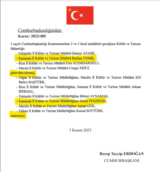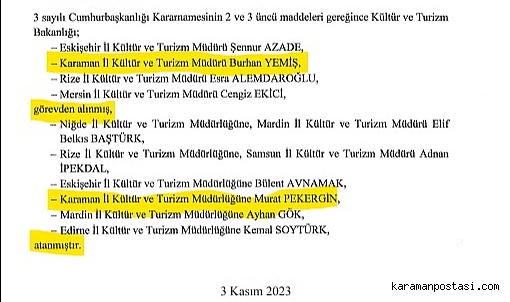 4 Ekim 2023 tarihli Resmi Gazete Yayınlandı . Karaman İl Kültür ve Turizm Müdürü Değişti Karaman'a Atanan Murat Pekergin Atandı .