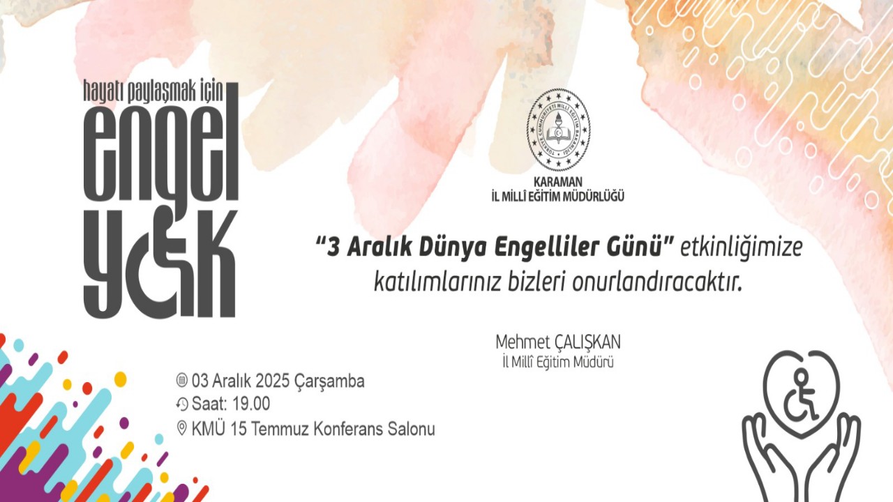 Karaman İl Millî Eğitim Müdürlüğü tarafından düzenlenen “3 Aralık Dünya Engelliler Günü” etkinliğimizde, engelli bireylerimizin toplumsal yaşama tam ve eşit katılımlarının desteklenmesi, farkındalığın artırılması ve birlikte daha kapsayıcı bir yaşam inşa edilmesi amacıyla bir araya geliyoruz.