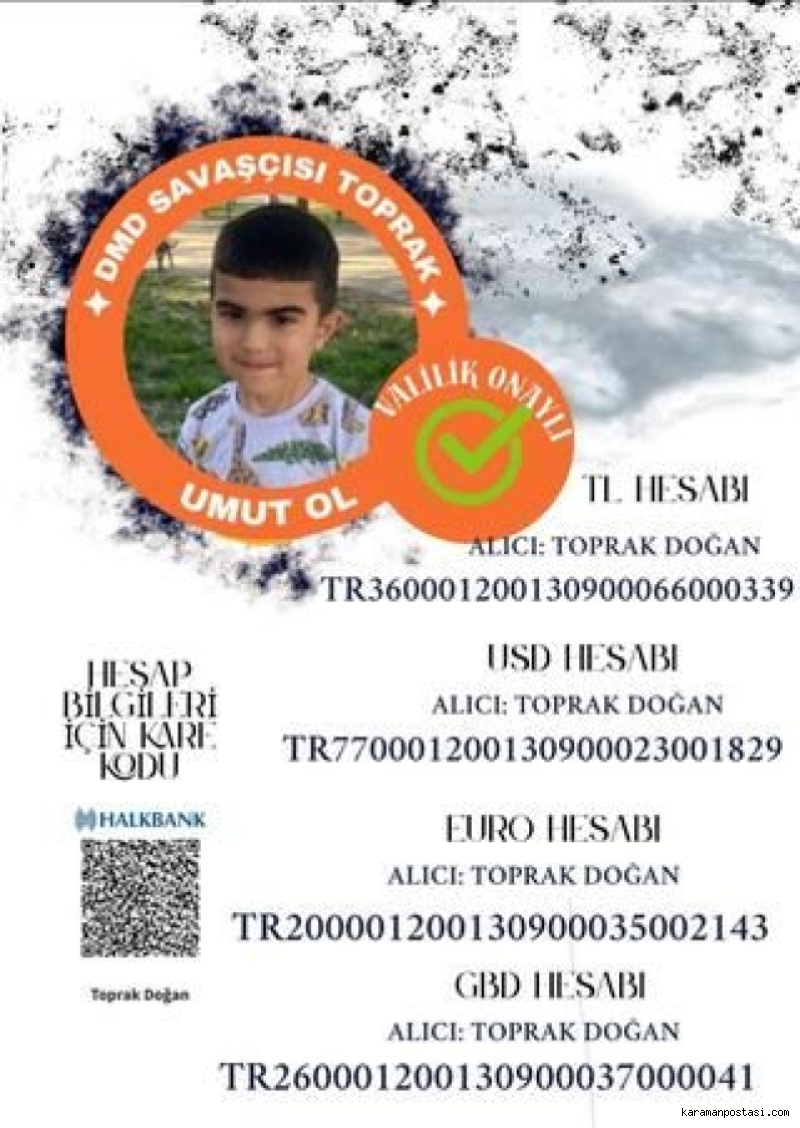 Minik Toprak'ın tedavi süreci yüksek maliyetler gerektiriyor. Ancak ailesi yılmadan mücadele ediyor. Toprak’ın yaşama tutunması için yürütülen yardım kampanyası karaman Valiliği tarafından resmen onaylandı. Banka hesap bilgileriyle bağış kabul edilen kampanya tamamen yasal zemine oturtulmuş durumda.Türkiye’nin dört bir yanından duyarlı vatandaşlar, DMD savaşçısı Toprak için destek olmaya çağrılıyor. Bağışlar, Halkbank aracılığıyla açılan TL, Euro, Dolar ve GBP hesaplarına güvenli şekilde yapılabiliyor.Destek Olmak İçin Hesap Bilgileri: