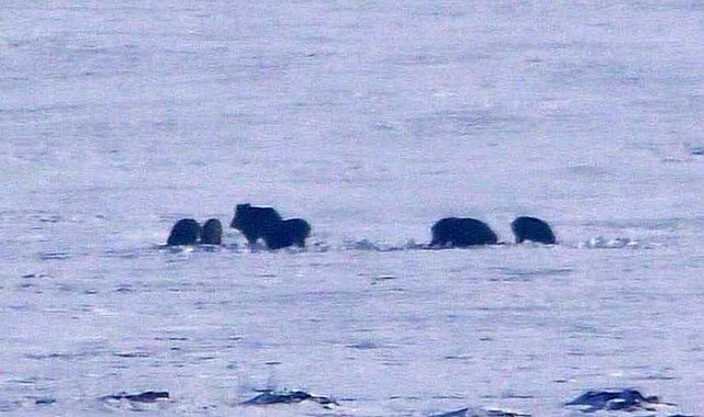 Kayıtlarda, bir arada duran yabani domuz sürüsü, karla kaplı arazide yiyecek aradığı yer alıyor.