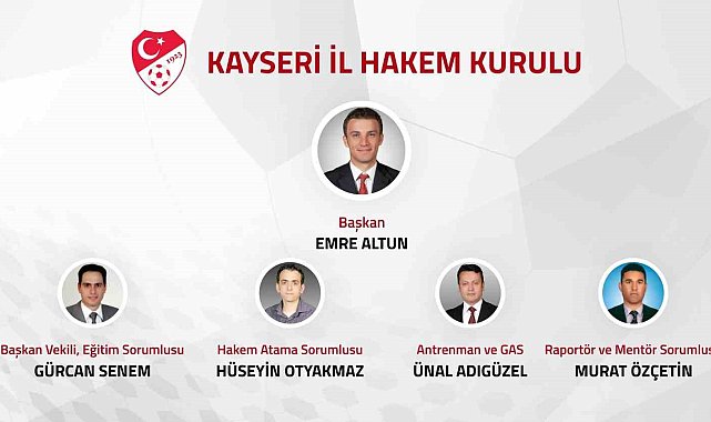 Kayseri İl Hakem Kurulu Başkanı ve kurul üyeleri atandı. Ahmet Cengiz Duman'ın yerine başkanlığa Emre Altun atanırken, kurul üyeleri ise değişti.Merkez Hakem Kurulu tarafından geçtiğimiz günlerde resmi olarak Kayseri İl Hakem Kurulu Başkanlığına atanan Emre Altun, yeni kurul üyeleri ile ilk toplantısını gerçekleştirdi. Dün yapılan toplantı sonrası görev dağılımı belli oldu. Yeni atanan İl Hakem Kurulu şu şekilde;Başkan: Emre AltunÜyeler:Gürcan Senem (Başkan Vekili - Eğitim Sorumlusu )Hüseyin Otyakmaz (Hakem Atama Sorumlusu )Ünal Adıgüzel (Antrenman ve Gözlemci Atama Sorumlusu )Murat Özçetin (Antrenman - Mentör Sorumlusu)