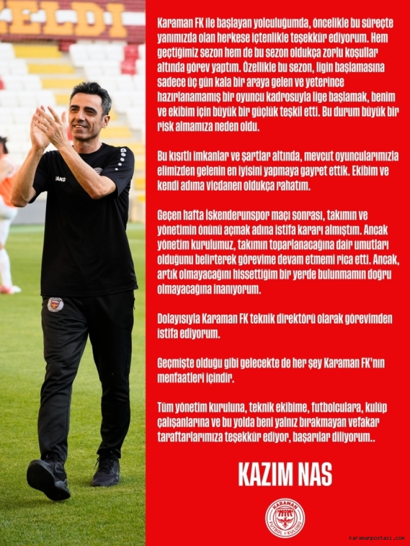Dolayısıyla karaman FK teknik direktörü olarak görevimden istifa ediyorum.