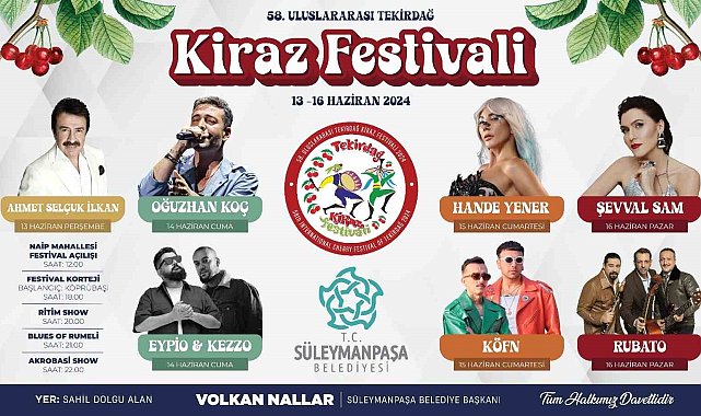 Süleymanpaşa Belediyesi tarafından 13-16 Haziran tarihleri arasında düzenlenecek 58. Uluslararası Tekirdağ Kiraz Festivali'ne katılacak sanatçılar belli oldu.13 Haziran Çarşamba günü saat 12.00'de Naip Mahallesi'nde gerçekleştirilecek açılış ile başlayacak 58. Uluslararası Tekirdağ Kiraz Festivali'nin ilk gününde ünlü tiyatrocu, senarist ve yönetmen Müfit Can Saçıntı stand-up gösterisi ile Tekirdağlıların karşısına çıkacak. Ritim şov ve Blues Of Rumeli grubu ile ısınacak gecede finali binlerce şiiri, altı kitap 10 şiir albümü ile şarkı sözü yazarlığında da zirveye çıkan Ahmet Selçuk İlkan yapacak.14 Haziran Perşembe günü rap dünyasının sevilen isimleri Eypio ile Kezzo ve yazdığı sözler, besteleri ve sesi ile pop müziğe yeni bir soluk getiren Oğuzhan Koç 58. Uluslararası Tekirdağ Kiraz Festivali'nin misafiri olacak.15 Haziran Cuma günü elektronik pop müziğin yükselen sesi Köfn ve Türk pop müziğinin kraliçesi Hande Yener festival coşkusunu zirveye taşımak için Süleymanpaşa sahnesinde en güzel eserlerini seslendirecek.16 Haziran Cumartesi günü festivalin kapanışında ünlü sanatçılar ile yaptıkları düetler ve 9/8 adını verdikleri albümleri ile büyük bir dinleyici kitlesine ulaşan Rubato ve sahnelerin aranan ismi Şevval Şam festivalin kapanışında kulakların pasını silecek."Herkesi 58. Uluslararası Tekirdağ Kiraz Festivali'ne katılmaya davet ediyorum"58. Uluslararası Tekirdağ Kiraz Festivali'ne katılacak sanatçıların belli olması sonrası açıklamalarda bulunan Süleymanpaşa Belediye Başkanı Volkan Nallar, maddi sıkıntılara rağmen kısa sürede güzel bir festival organize etmeye çalıştıklarının altını çizerken, "Göreve başlayalı sayılı günler oldu. Bu kısa sürede bize bırakılan büyük bir borç yüküyle karşılaştık. Bu yüzden festival bütçemizi kısıtlı tuttuk. Az zamanda şehrimiz için güzel bir program hazırladık. 58. Uluslararası Tekirdağ Kiraz Festivali, başta Süleymanpaşalı, Tekirdağlı hemşehrilerim olmak üzere Türkiye'nin dört bir yanından ve çevre ülkelerden gelecek milyonlarca kişinin gönüllerince eğlenebileceği bir festival olacak. Hem geleneklerimizi yaşatıp, hem de kültürümüzü misafirlerimize aktaracağız. Aynı zamanda da şehrimize ticari girdiler sağlayacağız. Bunların üstüne eğlence dolu konserler olacak. Ben herkesi 58. Uluslararası Tekirdağ Kiraz Festivali'ne katılmaya davet ediyorum. Şimdi eğlence zamanı" ifadelerini kullandı.