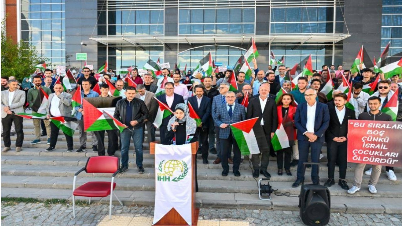 İnsan Hak ve Hürriyetleri Topluluğu tarafından üniversite kütüphanesi önünde düzenlenen programa akademisyenler, öğrenciler, siyasi parti temsilcileri ve sivil toplum kuruluşlarının üyeleri katıldı. Katılımcılar, ellerinde Filistin bayrakları ve İsrail’i protesto eden pankartlarla Sumud Filosuna destek verdi.