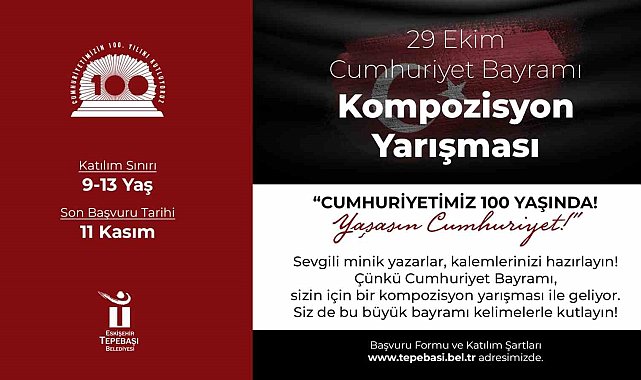 Tepebaşı Belediyesi Cumhuriyetimizin 100'üncü yılı dolayısıyla kompozisyon yarışması başvuruları devam ediyor. Yarışmanın başvuru süresi 11 Kasım'a kadar uzatıldı.Tepebaşı Belediyesi 29 Ekim Cumhuriyet Bayramı dolayısıyla 'Cumhuriyetimiz 100 Yaşında' sloganıyla kompozisyon yarışması düzenliyor.Düzenlenen kompozisyon yarışmasında çocuklar, yazdıkları kompozisyonlar ile Cumhuriyetin 100'üncü yaşını kutlayacak. 9-13 yaş arasındaki çocukların katılabileceği yarışma için son katılım tarihi 11 Kasım tarihine kadar uzatıldı.Tepebaşı Belediyesi yetkilileri, "Sevgili minik yazarlar, kalemlerinizi hazırlayın! Çünkü Cumhuriyet Bayramı, sizin için bir kompozisyon yarışması ile geliyor. Siz de bu büyük bayramı kelimelerle kutlayın" diyerek çocuklara çağrıda bulundu.Dereceye giren çocukların sürpriz hediyeler kazanacağı yarışmanın başvuru formu ve katılım şartlarına ise https://www.tepebasi.bel.tr/etkinlikler.asp adresinden ulaşılabiliyor.