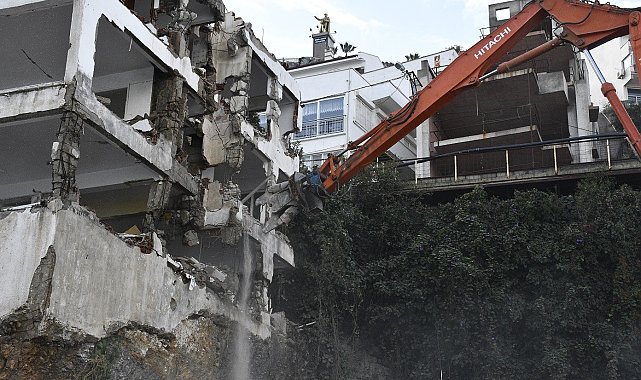 Can ve mal güvenliğini tehdit eden, hasarlı ve afete dayanıksız olduğu tespit edilen yapıların yıkım çalışmalarını sürdüren Kuşadası Belediyesi, son olarak Mahmut Esat Bozkurt Caddesi üzerinde bulunan bir binanın yıkımını kontrollü şekilde gerçekleştirdi.