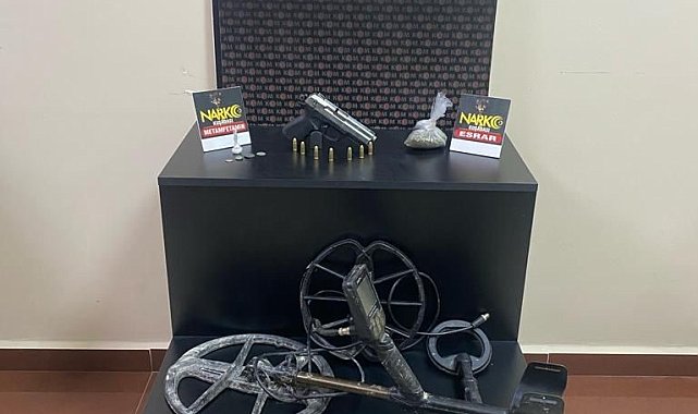 Kuşadası İlçe Emniyet Müdürlüğü Kaçakçılık ve Organize Suçlarla Mücadele Grup Amirliği ile Narkotik Büro Amirliği ekipleri tarafından düzenlenen ortaklaşa çalışmalarda durdurulan bir araçtan ruhsatsız tabanca ve uyuşturucu madde ele geçirildi.Kuşadası İlçe Emniyet Müdürlüğü Kaçakçılık ve Organize Suçlarla Mücadele Grup Amirliği ve Narkotik Büro Amirliği ekiplerinin ilçe genelinde Uyusturucu Madde Ticareti yapan şahıs ve organizasyonlara yönelik olarak ortaklaşa olarak sürdürdükleri kararlı ve çok yönlü çalışmaları neticesinde Bayraklıdede Mahallesi'nde Kuştur Uygulama noktasında 1 araç ekipler tarafından kontrollü olarak durduruldu. Şahsın aracında yapılan aramalarda 1 adet ruhsatsız tabanca, 1 adet şarjör, 4 adet farklı boyutlarda figürleri okunmayan sikke, tek parça halinde daralı 1,50 gram metamfetamin maddesi, tek parça halinde toplam daralı 15,35 gram Esrar maddesi ele geçirildi. A.S. isimli şahıs hakkında adli işlem başlatıldı.