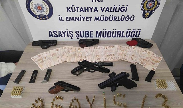 Kütahya'da evinde ve üzerinde yapılan aramada, 1'i kurusıkı olmak üzere 3 tabanca ele geçirilen kişi gözaltına alındı.İl Emniyet Müdürlüğü ekiplerince Lala Hüseyin Paşa Mahallesi üzerinde İ.Ö. (61) isimli şahıstan 1 adet sustalı bıçak, 1 adet el yapımı tabanca, şarjörü ve 8 adet fişek ele geçirilmiştir. Soruşturma çerçevesinde şahsın evinde yapılan aramada, 1 adet tabanca, bu tabancaya ait şarjör, 121 adet fişek, 1 adet kurusıkı tabanca, bu tabancaya ait 1 adet şarjör, 30 adet kurusıkı fişek, 4 adet fişek, 3 adet şarjör ele geçirildi.Gözaltına alınan şahıs gerekli işlemler için Asayiş Şube Müdürlüğüne teslim edildi.