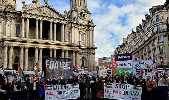 İngiltere'nin başkenti Londra'da on binlerce kişi Filistin'e destek protestosu düzenledi.İsrail'in Gazze Şeridi'ne yönelik saldırıları 64'üncü günde devam ederken, İngiltere'nin başkenti Londra'da on binlerce kişi Filistin'e destek protestosu düzenledi. Başkentteki Banka Kavşağı'nda bir araya göstericiler, Parlamento Meydanı'na yürüdü. Ateşkes çağrısında bulunan göstericiler, ellerinde filistin bayrakları taşıdı. Göstericiler, yürüyüş sırasında "Özgür Filistin", "Ateşkes şimdi", "Kuşatmayı kaldırın", "Nehirden denize kadar Filistin özgür olacak" ve "İsrail bir terör devletidir" sloganları attı.Polisin geniş güvenlik önlemleri aldığı gösteride, protestocuların İsrail Büyükelçiliğinin bulunduğu bölgeye girmeleri yasaklandı. Polis, protesto sırasında İsrail'i Nazi Almanya'sına benzeten bir pankart açtığı için bir göstericiyi gözaltına aldı. Gösteriye yaklaşık 20 bin kişinin katıldığı tahmin ediliyor.