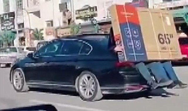 Şanlıurfa'da bir kişi yeni aldığı 65 inç ekran televizyonu lüks aracının bagajına oturan kişilerin kucağında taşıması bir başka sürücü tarafından cep telefonu görüntüsüne yansıdı.Şanlıurfa'nın Haliliye ilçesine bağlı Bamyasuyu Mahallesi 18 Mart Çanakkale Caddesinde 65 inç ekran televizyonun lüks aracının bagajına oturan kişilerin kucağında taşıtılması bir başka sürücü tarafından cep telefonu görüntüsüne yansıdı. Geçtiğimiz günlerde TOGG'un bagajında Urfa yöresine has isot taşınmasının ardından 65 inç ekran televizyonu lüks aracının bagajına oturan kişilerin kucağında taşıması sosyal medyada gündem oldu.Başka bir sürücü tarafından cep telefonu görüntüsüne yansıyan görüntülerin ardından bazı sosyal medya kullanıcıları vatandaşa tepki gösterdi.