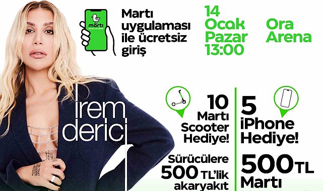 Ulaşım platformu Martı, İstanbul'da 100 bin TAG sürücüsüne ulaşmasını özel bir festivalle kutlayacak. Yapılan duyuruya göre 14 Ocak Pazar günü Ora Arena - Bayrampaşa'da düzenlenecek festivalde İrem Derici sahne alacak. Saat 13.00'te başlayacak etkinliğe katılım ücretsiz olacak. Martı uygulamasını gösteren herkes giriş yapabilecek.