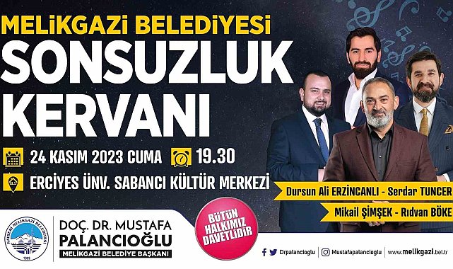 Sosyal ve kültürel programlarla farklı etkinlikleri vatandaşların beğenisine sunan Melikgazi Belediyesi, 'Sonsuzluk Kervanı' adlı şiir ve müzik programı düzenleyecek.