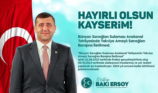 Milliyetçi Hareket Partisi (MHP) Kayseri Milletvekili Baki Ersoy; Tarım ve Orman Bakanı İbrahim Yumaklı ile yaptığı görüşmede aldığı müjdeleri "hayırlı olsun Kayserim" diyerek paylaştı."Tarım ve Orman Bakanımız İbrahim Yumaklı ile görüşmelerimiz neticesinde, Kayserimiz ile ilgili sözlerimizi almış bulunmaktayız" diyen Ersoy; "Bakanımızın talimatlarıyla; Yahyalı Kapuzbaşı Mahallesi Kapuz Deresinin durumu; 'Kayseri- Yahyalı Kapuzbaşı Mahallesi Kapuz Deresi Taşkın Kontrolü İşi'nin sözleşmesi 31.01.2023 tarihinde imzalanmış ve 09.02.2023 tarihinde yer teslimi yapılarak işe başlanmıştır. İşte yüzde 40 fiziki gerçekleşme sağlanmış olup çalışmalar devam etmektedir. 2024 yılı sonuna kadar bitirilmesi planlanmaktadır. Kayseri- Pınarbaşı Şehit Arda Şen Göleti Durumu; 'Kayseri- Pınarbaşı Şehit Arda Şen Göleti' işinin 15.08.2023 tarihinde ihalesi yapılarak 02.10.2023 tarihinde sözleşmesi imzalanmıştır. 2025 yılı sonuna kadar bitirilmesi planlanmaktadır. Bahçelik Sulaması Projesinin Durumu; Bahçelik Projesinde Bünyan Elbaşı ve Sarıoğlan sulamaları olmak üzere iki adet alt ünite bulunmaktadır. İnşaat çalışmaları devam etmektedir. Bünyan Elbaşı Sulaması: 5 bin 402 sulamada yüzde 75 oranında gerçekleşme sağlanmıştır. 03.05.2025 tarihine kadar bitirilmesi planlanmaktadır.Bünyan Sarıoğlan Sulaması: 22 bin 630 sulamada yüzde 85 gerçekleşme sağlanmıştır. 09.07.2025 tarihine kadar bitirilmesi planlanmaktadır. Develi Projesinin Durumu; Develi Projesi çerçevesinde 10bin 700 metre Zamantı Regülatörü ve Devirasyon Tüneli 2011 yılında, 187 hm3 Gümüşören Barajı 2015 yılında tamamlanmıştır. 89 bin 700 dekar zirai araziyi sulayacak olan Develi Ovası Sağ Sahil Sulamaları 2016 yılında tamamlanarak hizmete açılmıştır. Develi II. Merhale Projesi tamamlandığında 311.210 dekar zirai alan sulamaya açılacaktır. Proje çerçevesinde; toplam keşif bedeli 788 milyon TL olan ve 57 bin 160 dekar araziyi sulayacak Ağcaşar S2 Sulaması işinin sözleşmesi 11.04.2022 tarihinde imzalanmıştır. İşin inşaat kısmı Develi Sol Sahil Sulaması Ana İletim Hattı işi adı altında yapılacak olup, yüzde 63 fiziki gerçekleşme sağlanmıştır. Bu çalışmaları müteakip toplamda 136 bin 300 dekar zirai araziyi sulayacak olan; 2.1 milyar TL toplam keşif bedeli ile yatırım programında yer alan Develi Ovası Sol Sahil Sulamaları İkmali 2. Kısım (Gümüşören Barajı) (Batı Hattı) işi ile 1,2 milyar TL toplam keşif bedeli ile yatırım programında yer alan Develi Ovası Sol Sahil Sulamaları İkmali 3 Kısım (Gümüşören Barajı) (Doğu Hattı) işlerinin 03.01.2024 tarihinde gerçekleştirilmiştir. Bünyan Sarıoğlan Sulaması Anakanal Tahliyesinde Takviye Amaçlı Sarıoğlan Barajına İletilmesi; 'Bünyan Sarıoğlan Sulaması Anakanal Tahliyesinin Takviye Amaçlı Sarıoğlan Barajına İletilmesi' işinin 22.08.2023 tarihinde ihalesi gerçekleştirilmiş olup 09.10.2023 tarihinde sözleşmesi imzalanmış ve yer teslimi yapılarak işe başlanılmıştır. 2024 yılı sonuna kadar bitirilmesi planlanmaktadır" ifadelerine yer verdi.