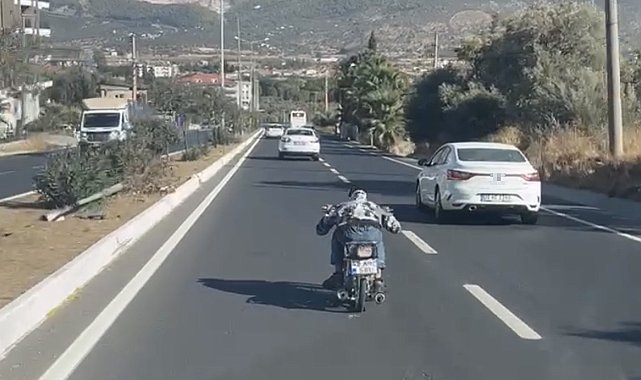 Muğla'nın Milas ilçesinde kask takmadığı görülen bir motosiklet sürücüsünün trafikteki tehlikeli sürüşü, cep telefonu kamerasına yansıdı.Milas-Bodrum karayolu üzerinde, ilerleyen bir motosiklet sürücüsünün trafiği tehlikeye düşürdüğü anlar cep telefonu kamerasına yansıdı. Kasksız olduğu görülen motosiklet sürücüsü motosikletin üzerine eğilerek hız yaptı, araçların arasından geçti. Hız sınırlarını aştığı iddia edilen motosiklet sürücüsü yanında giden araçlara aldırmayıp trafiği tehlikeye düşürdü. O anlar ise başka bir araçtaki kişi tarafından cep telefonu ile kaydedildi. Görüntülerde motosiklet sürücüsünün kasksız ve tehlikeli sürüşü yer aldı.