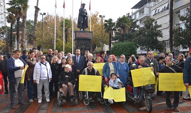 Aydın'ın Nazilli ilçesinde gerçekleştirilen Engelliler Günü etkinliğinde, Gazze'de engelli olmaya dikkat çekilirken, törende duygusal anlar yaşandı.Aydın'ın Nazilli ilçesinde Bedensel Engelliler Derneği (NBED), Engelsiz Engelliler Derneği ve Engelliler ve Engellilere Destek Derneği (NAZENDER), 3 Aralık Dünya Engelliler Günü nedeniyle ilk olarak belediye ardından İstasyon meydanında bir program gerçekleştirdi. Program kapsamında ilk olarak Belediye Meydanı'nda dernek üyeleriyle bir araya gelen dernek başkanları, "Gazze'de engelli olmak" başlıklı anlamlı ve duygusal bir basın açıklaması yaptı. Nazilli Engelliler ve Engellilere Destek Derneği (NAZENDER) Başkanı Tayfun Yazıcı; "Savaşa karşıyız, çünkü her bombada yüzlerce yeni engelli katılıyor dünya nüfusuna. Gazze'de İsrail bombardımanı altında engelsiz bireyler için bile çok zor şartlar varken, engellilerin durumu çok daha vahim. Tekerlekli sandalye ve değişik aparatlar kullanan engelliler bırakın kaçmayı bir kaç metre gidemiyor. Çalışmayan asansörler nedeniyle engelliler bombardımanlarda binaları terk edemedikleri için, zihinsel engelliler de yıkıntıların altında nerede olduklarını bildiremedikleri için hayatlarını kaybediyorlar. Türkiye dahil komşu ülkeler, hastalarla birlikte engellilerin de bir an önce o bölgeden çıkarılması için girişimlerde bulunmalıdırlar. Dünya nüfusuna her gün yeni engelliler katan İsrail'i, NAZENDER ve Nazillili engelliler olarak kınıyoruz. Savaşların olmadığı engelsiz bir dünya diliyoruz" dedi.Basın açıklamasının ardından Nazilli İstasyon Meydanı'nda 3 Aralık Dünya Engelliler Günü dolayısıyla Atatürk Anıtı önünde çelenk koyma töreni gerçekleştirildi. Nazilli'de 3 Aralık Dünya Engelliler Günü dolayısıyla İstasyon Meydanı'ndaki Atatürk Anıtı'na engelli derneklerinin çelenk koyması ile başladı. İstasyon Meydanı'ndaki törene Belediye Başkan Vekili Ali Ertürk, NAZENDER Başkanı Tayfun Yazıcı, NBED Başkanı Ali Köse, Engelsiz Engelliler Dernek Başkanı Ahmet Ünlü, meclis üyeleri, siyasi partilerin ilçe temsilcileri, özel eğitim ve rehabilitasyon okullarının yöneticileri, çok sayıda engelliler ve vatandaşlar katıldı.Nazilli İstasyon Meydanı'nda yapılan törende Engelsiz Engelliler, NAZENDER, NBED derneklerinin çelenkleri Atatürk Anıtı'na kondu. Ardından tören saygı duruşu ve İstiklal Marşının okunmasının ardından sona erdi. Son olarak günün hatırası olarak bir toplu fotoğraf çekildi. Akşamüstü ise Nazilli Bedensel Engelliler Derneği önünde ebediyete göçmüş engelliler ve şehitler için mevlidi şerif okutuldu ve hayır dağıtıldı.