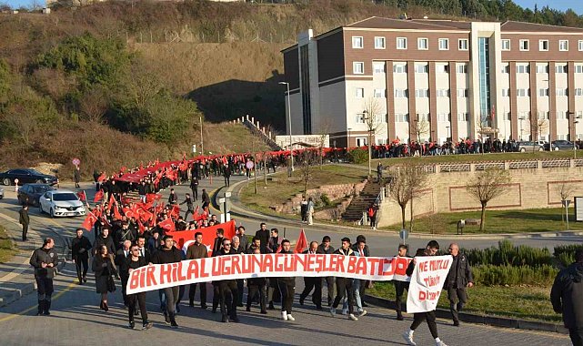 Düzce Üniversitesi öğrenci toplulukları tarafından "Teröre Karşı Omuz Omuza Yürüyüşü" düzenlendi."Teröre Karşı Omuz Omuza Yürüyüşü"ne Rektör Prof. Dr. Nedim Sözbir, Rektör Yardımcıları Prof. Dr. İlhan Genç ve Prof. Dr. Ali Öztürk, Fen Edebiyat Fakültesi Dekanı Prof. Dr. Duygu Ekinci, Düzce Üniversite Genel Sekreteri Nihat Yıldız, öğretim elemanları, daire başkanları ve öğrenciler katıldı.Türkiye'nin 7 bölgesi ve 81 ilinden 30 binin üzerinde öğrencisi bulunan Düzce Üniversitesi bünyesindeki öğrenci topluluklarım birlikte düzenlediği yürüyüşe, ellerinde Türk bayraklarıyla katılan öğrenciler, Fen Edebiyat Fakültesi'nden başlayarak, 15 Temmuz Demokrasi Meydanı'na kadar sloganlar eşliğinde yürüdü."Teröre geçit vermeyeceğiz"15 Temmuz Demokrasi Meydanı'na gelen öğrenciler, şehitler için saygı duruşunda bulundu, İstiklal Marşı ve Kur'an-ı Kerim'in okunmasının ardından, Türk Birliği Topluluğu Başkanı Emirhan Kıran basın bildirisini okudu. Terörü ve teröre destek verenleri lanetleyerek başladığı açıklamasında Kıran, "Son günlerde gelen şehit haberleri yüreğimizi yakmış, tüm Türkiye'yi yasa boğmuştur. Ne yazık ki alışmamamız gereken bu haberlere hepimiz alıştık ve bizim için canından vaz geçen kahraman asker ve polislerimizin isimlerini 45 saniye bile hatırlayamaz olduk. Televizyonlarda, sosyal medyada 1, 3, 5, 12 diye tabir edilen sayıların aslında bir baba, bir ağabey, bir kardeş olduğunu, onlarında düne kadar bizim gibi bir hayatı olduğunu unutmamak ve farkına varmak gerekir. Biz milliyetçi, Atatürk'ün izinde Türk çocukları olarak, bu günleri hiçbir zaman unutmayacağız ve unutturmayacağız. Düzce Üniversitesi öğrencileri olarak üniversitemizde de terörün sempatizanlığını yapmak isteyenlere geçit vermeyeceğiz" ifadelerini kullandı.