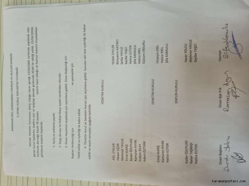 Karaman Özel Gereksinimli Erenler ve Aileleri Derneği, ilk genel kurul toplantısını yoğun katılımla tamamladı. Toplantı, Emekli Evi’nde gerçekleştirildi.Genel kurul programı, saygı duruşu ve İstiklal Marşı’nın okunmasıyla başladı. Ardından yapılan yoklamada yeterli çoğunluğun sağlandığı tespit edilerek toplantı resmen açıldı. Genel kurulun açılış konuşmasını Dernek Başkanı Hasan Uçar yaptı. Uçar, konuşmasında derneğin kuruluş süreci, hedefleri ve özel gereksinimli bireyler ile ailelerine yönelik yürütülmesi planlanan çalışmalar hakkında bilgi verdi.Başkan Uçar karaman Valisi Hayrettin Çiçek'e Akparti Karaman Milletvekili Osman Sağlam'a ve Karaman Belediye Başkanı Savaş Kalaycı'ya derneğe verdiği desteklerin kendileri için son derece kıymetli olduğunu belirterek teşekkür etti. Başkan Kalaycı’nın her zaman özel gereksinimli bireylerin ve ailelerinin yanında olduğunu ifade eden Uçar, bu desteklerin dernek çalışmalarına güç kattığını söyledi. Samimi ve birlik beraberlik içerisinde geçen genel kurul toplantısında, derneğin gelecek dönem faaliyetleri değerlendirilirken üyeler de görüş ve önerilerini paylaştı. Toplantı, iyi dilek ve temennilerin ardından sona erdi.