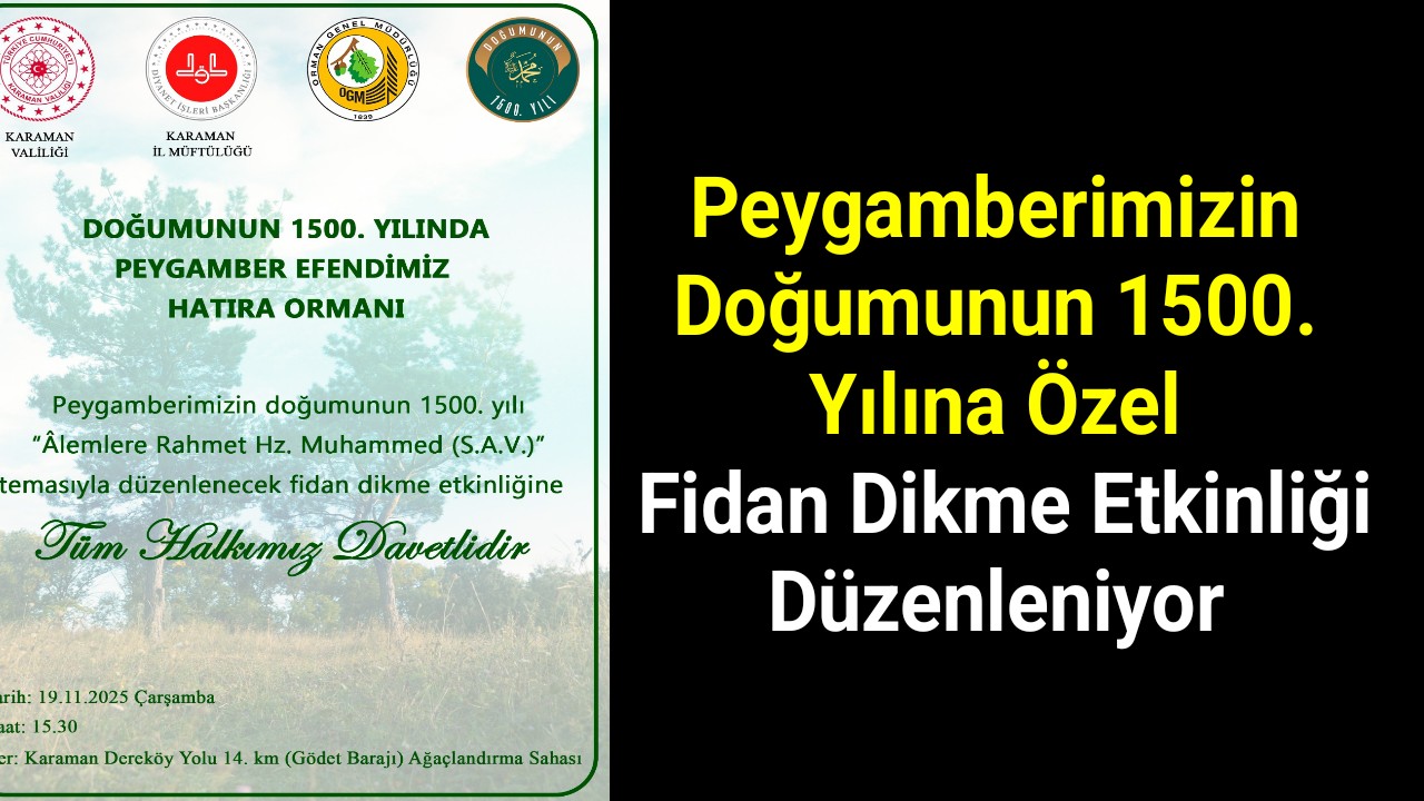 Karaman Valiliği ve İl Müftülüğü, Peygamber Efendimiz Hz. Muhammed'in doğumunun 1500. yılı dolayısıyla düzenlenecek fidan dikme etkinliğine tüm vatandaşları davet ediyor. "Her fidan bir nefes, her nefes bir hayırdır" mesajıyla duyurulan etkinlik, 19 Kasım 2025 Çarşamba günü saat 15.30'da Gölet Barajı Ağaçlandırma Sahasında gerçekleştirilecek. "Her fidan bir nefes, her nefes bir hayırdır" mesajıyla duyurulan etkinlik, Peygamber Efendimize saygı ve sevginin bir ifadesi olarak gerçekleştirilecek.