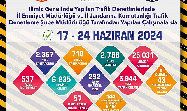 Eskişehir'de polis ve jandarma ekiplerince son bir haftada ortak gerçekleştirilen trafik denetimlerinde 25 bin 31 araç ve sürücü kontrol edilirken, 5 bin 944 adet ceza yazıldı.Edinilen bilgiye göre, İl Emniyet Müdürlüğü ve İl Jandarma Komutanlığı Trafik Denetleme Şube Müdürlüğü tarafından trafik denetimleri yapıldı. İl genelinde 17-24 Haziran tarihleri arasında yürütülen çalışmalarda 2 bin 367 yük taşımacılığı, 710 yolcu taşımacılığı, 2 bin 788 alkol ve 6 bin 235 emniyet kemeri denetimi gerçekleştirildi. Ekiplerce 25 bin 31 araç ve sürücü ile 537 motosikletin de kontrol edildiği çalışmalarda 292 araç men edilirken, 5 bin 944 adet trafik cezası yazıldı. Çalışmalar sırasında 43 yaralanmalı ve 57 maddi hasarlı trafik kazasına müdahale eden ekipler 144 vatandaşın sürücü belgesine el koydu.