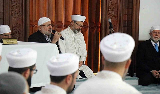 Sakarya'nın Akyazı ilçesinde kıraat eğitimlerini tamamlayan hafızların icazet törenine katılan Diyanet İşleri Başkanı Prof. Dr. Ali Erbaş, "Kur'an-ı Kerim sürekli akan bir çeşme gibidir. Çeşmenin suyu her aktığında nasıl taze akıyorsa, Kur'an-ı Kerim de her okunduğunda sanki yeni inmiş gibi okunuyor" dedi.Diyanet İşleri Başkanı Prof. Dr. Ali Erbaş, Akyazı'da bulunan Darul Kurra Camisi'nde "Aşere, Takrib, Tayyibe İcazet Merasimi"ne katıldı. Akyazı İlçe Müftülüğü ve Kıraat Eğitim Derneği tarafından düzenlenen törende, Şeyh'ül Kurra Hüseyin Harputoğlu Kur'an Kursu bünyesinde Kırâat (Aşere-Takrib-Tayyibe) bölümünde eğitimini tamamlayarak Kur'an-ı Kerim'i 10 farklı kıraat imamı ve ravilerine göre okuyarak kurra hafızlık icazeti almaya hak kazanan 24 kurra hafız, imam ve müezzin Kur'an-ı Kerim okudu.Törende konuşan Ali Erbaş, "Kur'an-ı Kerim, Rabbimizin Peygamber efendimize indirdiği, gönderdiği en büyük mucize. İnişi ile hıfzı ile tilaveti ile kıraati ile mucize. Bugün hocalarımızın eğitimini tamamlamış olduğu Aşere-Takrib-Tayyibe usulü ile okunuşuyla da mucize. Böyle bir kitap yok dünya üzerinde. Biraz önce örnek okuyuşları dinledik, hocalarımızın bir Ayet-i Kerimeyi kıraat imamlarımızın ve o imamlarımızın ravilerinin farklı farklı okuyuş tarzları ile okuduğunu dinledik. İşte Cenab-ı Hakkın, 'Denizler biter de, Rabbimin kelimeleri bitmez' dediğine bir örnektir bu. Her okuyuşta ayrı bir güzellik var, ayrı bir mana var. Kur'an-ı Kerim sürekli akan bir çeşme gibidir. Çeşmenin suyu her aktığında nasıl taze akıyorsa, Kur'an-ı Kerim de her okunduğunda sanki yeni inmiş gibi okunuyor" ifadelerine yer verdi.Reisül Kurra Mustafa Demirkan'ın riyasetindeki merasime, Erbaş'ın yanı sıra Akyazı Kaymakamı Mustafa İkbal Eşki, Akyazı Belediye Başkanı Bilal Soykan, İl Müftüsü Mehmet Aşık, Diyanet İşleri Başkanlığı Mushafları İnceleme ve Kıraat Kurulu Başkanı Hafız Osman Şahin, Sakarya Uygulamalı Bilimler Üniversitesi Rektörü Prof. Dr. Mehmet Sarıbıyık ile hafızların aileleri ve çok sayıda vatandaş katıldı.