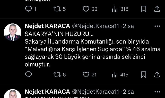 Sakarya İl Jandarma Komutanı Nejdet Karaca, son bir yılda çeşitli suçların azalmasındaki yüzdelikleri 'Sakarya'nın Huzuru' başlığıyla sosyal medyada paylaştı. Verilere göre hırsızlık olaylarının büyük oranda azaldığı Sakarya, bu suçun düşüş oranına göre 30 büyükşehir arasında birinci oldu.Sakarya İl Jandarma Komutanlığı, sorumluluk bölgesinde suçların önlenmesine yönelik çalışmalarına devam ediyor. İl Jandarma Komutanı Nejdet Karaca, jandarma bölgesinde yaşanan uyuşturucu, asayiş ve hırsızlık olaylarının son bir yıldaki verilerini sosyal medyada 'Sakarya'nın Huzuru' başlığıyla paylaştı. Karaca paylaşımında, "Sakarya, narkotik suçlarla mücadele çerçevesinde son bir yılda yüzde 174'lük artışla 30 büyükşehir arasında operasyon sayısını en fazla arttıran il olmuştur. Son bir yılda iş yerinden ve kurumdan hırsızlık olaylarında yüzde 66,7 azalma sağlayarak, 30 büyükşehir arasında birinci olmuştur. Evden hırsızlık olaylarında yüzde 71,4 azalma sağlayarak, 30 büyükşehir arasında birinci olmuştur. Mal varlığına işlenen suçlarda yüzde 46 azalma sağlayarak, 30 büyükşehir arasında sekizinci olmuştur. Kişilere karşı işlenen suçlarda yüzde 10,7 azalma sağlayarak, 30 büyükşehir arasında ikinci olmuştur" ifadelerini kullandı.