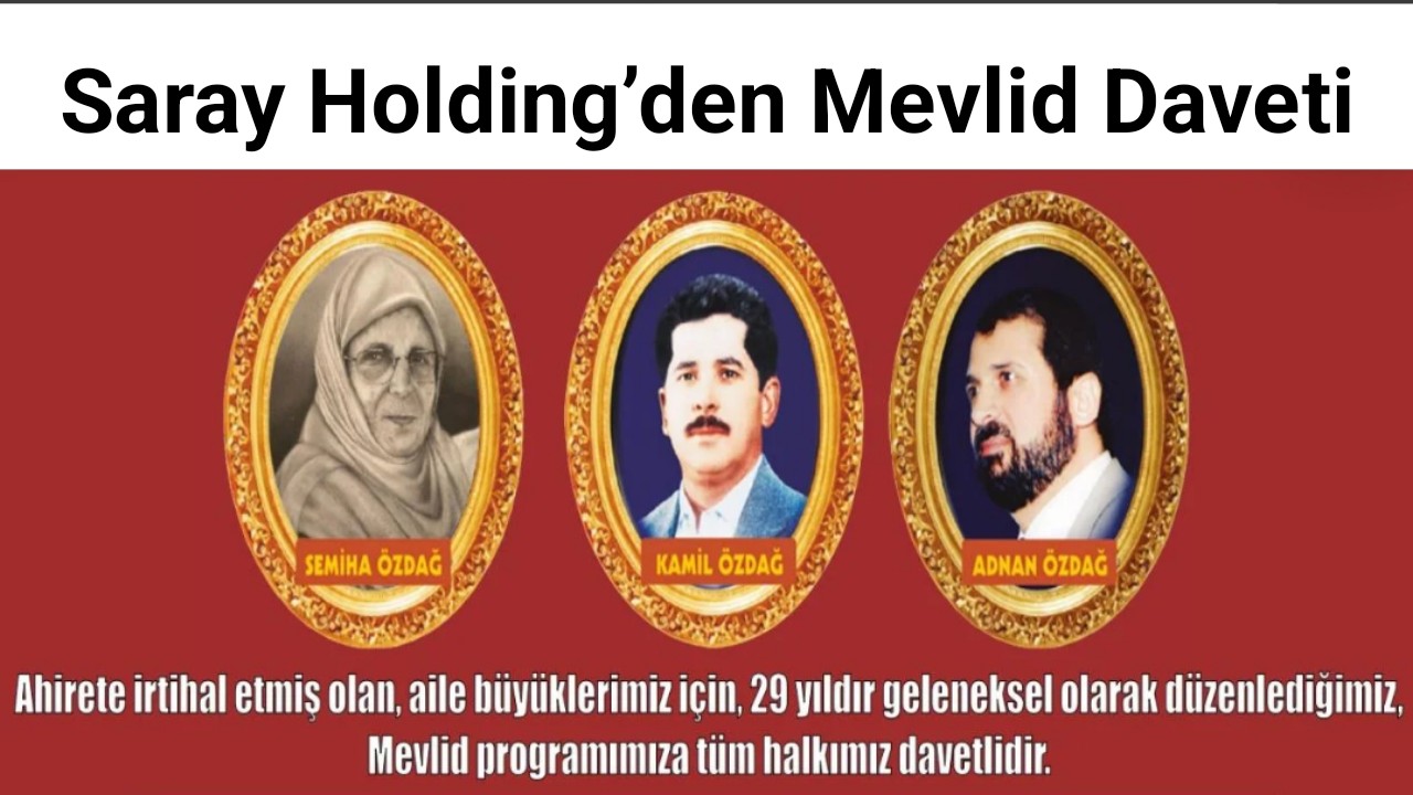 “İlimizin kuruluşlarından olan SARAY HOLDİNG’ in sahipleri ÖZDAĞ Ailesinin değerli büyüklerinden rahmetli babaları hayırsever insan Durhasan’ın Kamil ÖZDAĞ’ın vefatının 56.yıl dönümünde, Anneleri Hayırsever insan Semiha ÖZDAĞ’ın vefatının 6 yıl ve SARAY HOLDİNG’ in kurucularından olan rahmetli Ağabeyleri Hacı Adnan ÖZDAĞ’ın vefatının 30.yıl dönümünde, Vatan savunmasında şehit düşen tüm Şehitlerimizin ve Saray Çalışanlarının ebediyete intikal etmiş olanların ruhlarını yâd etmek amacıyla 19 ARALIK 2025 günü Cuma Namazı öncesi Aktekke Camii, Dikbasan Camii, Arapoğlu CAMİİ, Yunus Emre Camii ve Üniversite Camii’nde Hatm-i Şerif ve Mevlid-i Şerif Merasimi icra edilecektir ve Geleneksel etli pilav dağıtımı yapılacaktır.