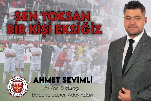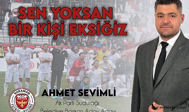 AK Parti Sudurağı Belediye Başkan Aday Adayı Ahmet Sevimli yapmış olduğu açıklamada" “Bir şehrin tanıtımının en önemli etkenlerinden biri spordur. Ülkemizde ise en çok ilgi gören spor dalı futboldur. Şehrimizi 2.lig de temsil eden Karaman F.K. geçen sezon şampiyon olarak büyük bir başarıya imza attı. Çarşamba günü oynayacağımız kritik Karaman FK Iğdır FK müsabakasına tüm Karaman halkımız gelmelidir. Biz Karamanlıyız, Atatürk’ün Ata yurdunun çocukları, Yunus Emre’nin torunlarıyız Türk Dilinin Başkentine Yakışır Şekilde takımımıza destek vermeliyiz." dedi.