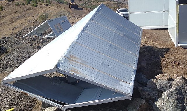 Adıyaman'ın Gerger ilçesine bağlı Ağaçlı Köyünün Gömük Mezrasında şiddetli rüzgar depremzedeler için verilen katlanabilir konteynerleri uçurdu.