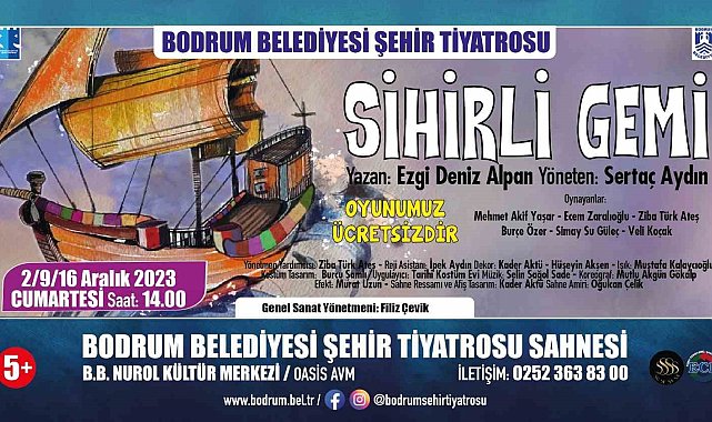Bodrum Belediyesi Şehir Tiyatrosu tarafından çocuk oyunu "Sihirli Gemi" cumartesi günleri Nurol Kültür Merkezi'nde sahnelenecek.Bodrum Belediyesi Şehir Tiyatrosu, her cumartesi saat 14.00'te renkli karakterlerin yer aldığı çocuk oyunu Sihirli Gemi'yi tiyatro severlerle buluşturacak.Dünyada ve özellikle üç tarafı denizle çevrili Türkiye'de önemli bir konu olan deniz kirliliği sorununa odaklanan oyun renkli rejisi, özgün şarkıları ve danslarıyla seyircilerini korsanların, papağanların, balıkların dünyasına davet ediyor.Oyunda, çocukların bakışıyla deniz kirliliğinin sebepleri ve sonuçlarından bahsedilirken, dünyanın tüm canlılara ait olduğu ve çocuklara güzel bir gelecek armağan etmek için herkesin sorumlulukları olduğunu vurgulanıyor. Ayrıca hava kirliliği, orman yangınları, termik santraller gibi ekolojik sorunların bir bütün olduğunu yansıtan oyun, küçük seyircilerini eğlendirirken deniz sevgisinin önemini anlatıyor.Yönetmen Sertaç Aydın oyun ile ilgili Sihirli Gemi'nin sezon boyunca yıldız tozlarını serpmeye devam edeceğini söylerken "Sihir hayatınızdan hiç eksik olmasın. Yıldız tozları tüm çocukları sarsın" dedi.