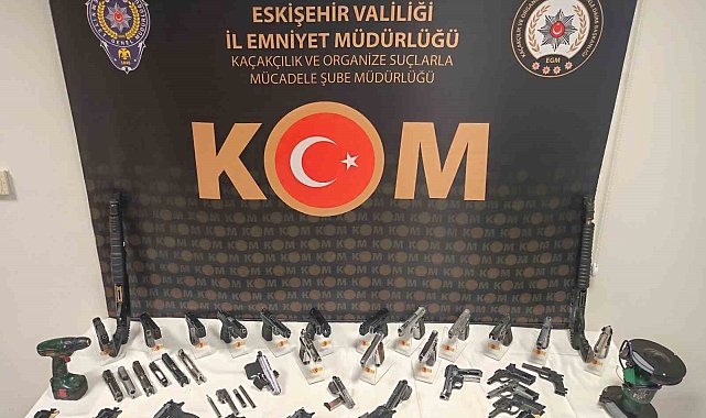 Eskişehir'de polis ekiplerince yapılan operasyonda evini silah atölyesine çeviren şahsa ait çok sayıda tabanca, tüfek, silah parçaları ve uyuşturucu madde ele geçirildi.Edinilen bilgilere göre, Eskişehir Cumhuriyet Başsavcılığı'nın koordinesinde, İl Emniyet Müdürlüğü'ne bağlı Kaçakçılık ve Organize Suçlarla Mücadele Şube Müdürlüğü (KOM) ekiplerince, 'Silah Ticareti'ne yönelik çalışmalar yürütüldü. Yapılan çalışma sonucunda 2 şüpheli yakalanırken, şüphelilerden birinin evini silah atölyesine dönüştürdüğü tespit edildi. Operasyon çerçevesinde şahsın evinde yapılan aramada; 26 ruhsatsız tabanca,2 pompalı tüfek, 134 değişik çap ve markalarda fişek, 6 dolu kartuş, 46 şarjör, 24 silah sürgüsü, 15 silah gövdesi, 10 tabanca namlusu, 7 icra yayı, 8 matkap ucu, 1 pafta takımı, 1 taşlama motoru, 1 şarjlı matkap, 2 hassas terazi ve 10 gram metamfetamin uyuşturucu madde ele geçirildi.Operasyon çerçevesinde gözaltına alınan şüphelilerin işlemlerinin sürdüğü öğrenildi.