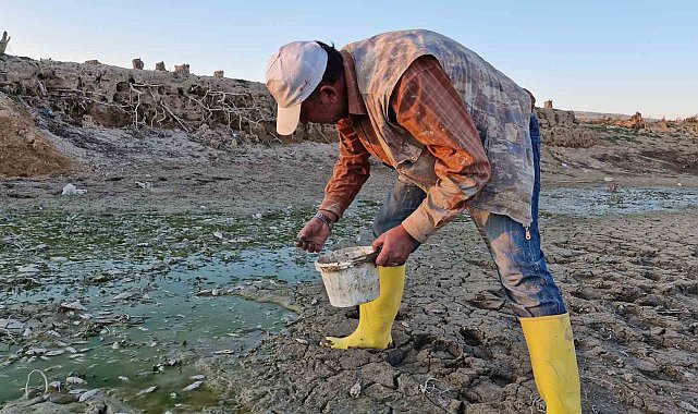 Karaman'da su seviyesinin düştüğü barajdaki su birikintilerinde mahsur kalan yavru balıklar amatör balıkçılar tarafından kovalarla kurtarılmaya çalışıldı.