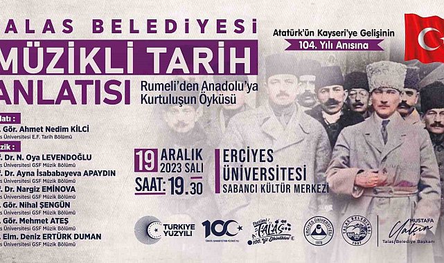 Talas Belediyesi'nin Atatürk'ün Kayseri'ye gelişinin 104. yıldönümü için hazırladığı program merakla bekleniyor.'Festival Talas 100. Yıl Etkinlikleri' çerçevesinde düzenlenecek 'Müzikli Tarih Anlatısı'nda Balkan Savaşlarından başlayıp Milli Mücadele ve cumhuriyetin ilanına kadar geçen süre anlatılacak. Erciyes Üniversitesi (ERÜ) Öğretim Görevlisi Ahmet Nedim Kilci'nin anlatımıyla gerçekleşecek programda Güzel Sanatlar Fakültesi Dekanı Prof. Dr. N. Oya Levendoğlu'nun yanı sıra öğretim üyeleri Prof. Dr. Ayna İsababayeva Apaydın, Prof. Dr. Nergis Eminova, Öğr. Gör. Nihal Şengün, Öğr. Gör. Mehmet Ateş ve Öğr. Elm Deniz Ertürk Duman sahne alacak. 'Rumeli'den Anadolu'ya Kurtuluşun Öyküsü' konulu program, 19 Aralık Salı günü saat 19.30'da başlayacak.ERÜ Sabancı Kültür Merkezi'nde düzenlenecek olan program, Talas Belediyesi'nin tüm etkinliklerinde olduğu gibi yine ücretsiz olarak izlenebilecek.