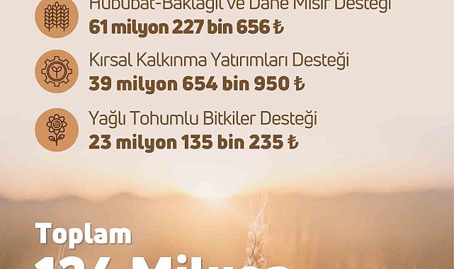 Tarım ve Orman Bakanı İbrahim Yumaklı, tarımsal destekleme ödemelerinin bugün çiftçilerin hesaplarına aktarılacağını açıkladı.Bakan Yumaklı, sosyal medya hesabından yaptığı açıklamada, "124 milyon 17 bin TL tarımsal destekleme ödemesini bugün çiftçilerimizin hesaplarına aktarıyoruz. Hayırlı ve bereketli olsun" ifadelerini kullandı.Hububat-Baklagil ve Dane Mısır Desteği 61 milyon 227 bin 656 lira, Kırsal Kalkınma Yatırımları Desteği 39 milyon 654 bin 950 lira, Yağlı Tohumlu Bitkiler Desteği 23 milyon 135 bin 235 lira olarak açıklandı.