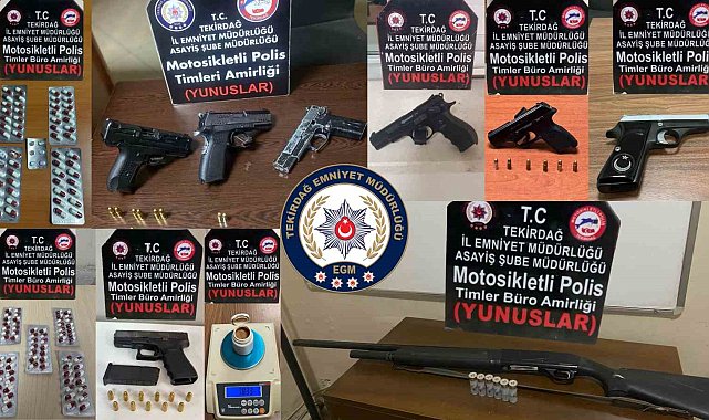 Tekirdağ il genelinde polis ekiplerince yapılan uygulamalarda, silah ve uyuşturucu madde ele geçirilirken olaylarda 20 şüpheli yakalandı.Tekirdağ İl Emniyet Müdürlüğü Asayiş Şube Müdürlüğü Motosikletli Polis Timleri Büro Amirliği görevlilerince suçları önlemeye yönelik çalışmalar sürüyor. Son bir haftada Tekirdağ İl geneli yapılan uygulamalarda 6 adet ruhsatsız tabanca ve 26 adet fişek, 1 adet kuru sıkı tabanca, 1 adet av tüfeği, 78.33 gram eroin uyuşturucu madde, 124 adet sentetik uyuşturucu hap, uyuşturucu ticaretinden elde edildiği değerlendirilen 2 bin 25 lira ele geçirildi.Uygulamalarda 20 şahıs yakalandı.