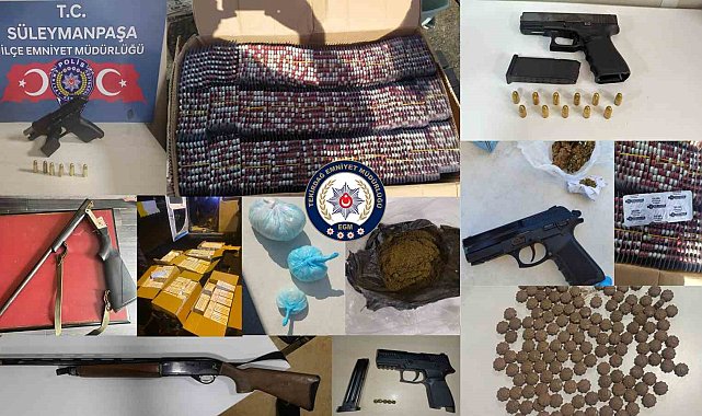 Tekirdağ'ın Süleymanpaşa ilçesinde polisin uygulama noktasında yaptığı çalışmalarda binlerce uyuşturucu hap ele geçirilirken, olayda 15 şüpheli yakalandı.Suç unsurlarının Tekirdağ'a girişinin önlenmesi ve şüphelilerinin yakalanması amacıyla Tekirdağ'ın Süleymanpaşa ilçesi TOKİ Uygulama noktasında polisin uygulamaları sürüyor. Son zamanlarda yapılan uygulamalar sonucunda ayrı ayrı olmak üzere 15 şahıstan toplamda, 15 bin 827 adet uyuşturucu hap, 95 gram metamfetamin, 74 gram toz kubar, 54 gram esrar maddesi, 4 adet ruhsatsız tabanca 2 adet ruhsatsız tüfek ele geçirildi.Olayda 15 şüpheli ifadeleri alınmak üzere yakalandı.