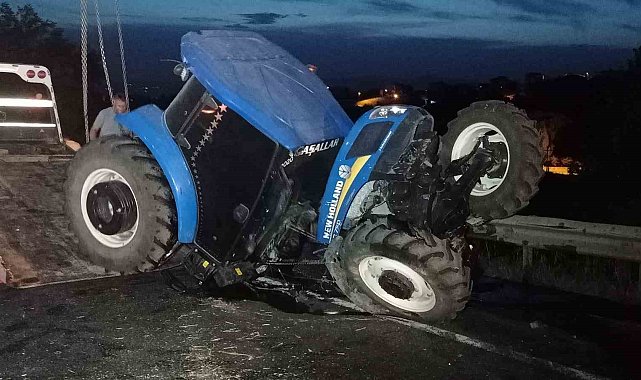 Çarpışmanın etkisiyle savrularak yol kenarında ki bariyerlere çarpan traktör ikiye bölündü.
