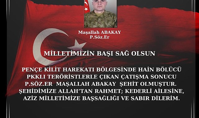 Eskişehir Valisi Hüseyin Aksoy, teröristlerle çatışırken şehit olan Piyade Sözleşmeli Er Maşallah Abakay için bir taziye mesajı yayımlayarak, "Şehidimize Allah'tan rahmet, kederli ailesine, yakınlarına, Türk Silahlı Kuvvetlerimize ve Aziz Milletimize başsağlığı ve sabırlar dilerim" dedi.Pençe-Kilit 2 Harekat bölgesinde PKK'lı teröristlerle çıkan çatışma sonucunda Piyade Sözleşmeli Er Maşallah Abakay'ın (23) şehit oldu. Muş'un merkeze bağlı Sungu Beldesi'nde şehit haberi aileye askeri yetkililer tarafından iletilirken, Eskişehir Valisi Hüseyin Aksoy bir taziye mesajı yayımladı. Vali Aksoy, yayımlamış olduğu mesajında, "Pençe Kilit 2 bölgesinde şehit olan P. Söz. Er Maşallah Abakay'ın şehadet haberini derin bir üzüntüyle öğrenmiş bulunuyorum. Şehidimize Allah'tan rahmet, kederli ailesine, yakınlarına, Türk Silahlı Kuvvetleri'mize ve aziz milletimize başsağlığı ve sabırlar dilerim" ifadelerini kullandı.Şehidin cenazesi yarın öğle namazına müteakip Sungu Beldesi'ndeki Merkez Camisi'nde kılınacak cenaze namazının ardından toprağa verilecek.