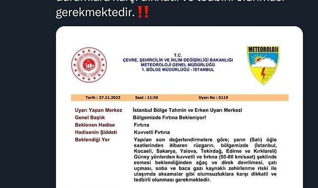 Sakarya Valiliği, sosyal medyadan yarın için kuvvetli fırtına uyarısında bulundu.Meteoroloji Genel Müdürlüğü'nden elde edilen bilgilerin neticesinde Sakarya Valiliği, sosyal medyadan yarın için vatandaşları kuvvetli fırtına hususunda uyardı. Valiliğin sosyal medyasından yapılan açıklamada, "İlimizde rüzgarların yarın öğle saatlerinden itibaren güney yönlerden kuvvetli fırtına şeklinde esmesi beklenmektedir. Olumsuz hava şartlarında yaşanabilecek durumlara karşı dikkatli ve tedbirli olunması gerekmektedir" ifadeleri yer aldı.