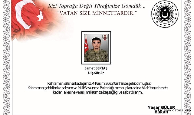 Milli Savunma Bakanlığı, Van'ın Başkale ilçesinde el yapımı patlayıcı maddenin (EYP) patlaması sonucu Er Samet Bektaş'ın şehit olduğunu bildirdi.