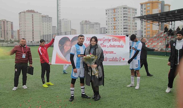 Sarız Anadoluspor'un savunma oyuncusu Harun Gültekin, Amaratspor karşılaşması öncesi takım arkadaşları ve taraftarların tezahüratları eşliğinde kız arkadaşına evlilik teklifi yaptı.Kayseri Şeker 1. Amatör Küme C Grubu ekiplerinden Sarız Anadoluspor, ligin 14. haftasında Amaratspor ile karşı karşıya geldi. Karşılaşma öncesi Sarız Anadoluspor'un savunma oyuncusu Harun Gültekin, taraftarın önünde kız arkadaşı Amine Bilir'e sürpriz evlilik teklifi yaptı. Müsabaka öncesi kız arkadaşı Amine Bilir'i saha içine getiren Harun Gültekin açılan, "Yıllar sonra geriye dönüp baktığımda tüm anılarımda sen ol istiyorum. Benimle evlenir misin?" yazılı pankartı ile diz çökerek yaptığı evlilik teklifine 'evet' yanıtını aldı.Gültekin, aldığı 'evet' cevabı üzerine büyük bir mutluluk yaşadı ve kız arkadaşına yüzüğünü taktı. Yapılan evlilik teklifiyle yeşil sahada renkli anlar yaşandı.