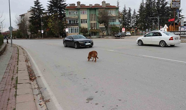 Eskişehir'de bir sokak köpeğinin yol ortasında beklemesi sürücüleri zor anlar yaşattığı görüldü.Osmangazi Mahallesi Basın Şehitleri Caddesi'nde sabah saatlerinde yolun ortasında bekleyen köpek sürücülere zor anlar yaşattı. Yola dökülen bir maddeyi koklamak için dakikalarca yolun ortasında duran köpeği yolun dışına almak isteyen vatandaşlarda başarılı olamadı. Araçların çarpmamak için çaba gösterdiği köpek trafiğinde yoğunlaşmasına neden oldu. Araç kornalarına da aldırış etmeyen köpek daha sonra kovalama sonucu yolun ortasından kaçarak, sokak aralarına girdi.
